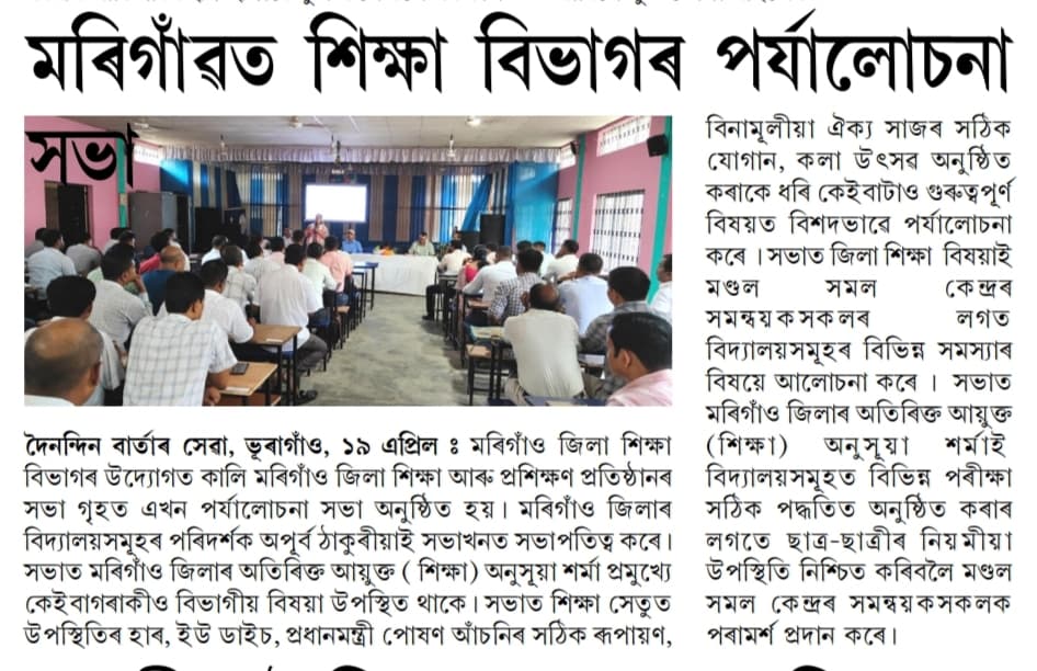 বৰ্তমানৰ তথ্য-প্ৰযুক্তিৰ দ্ৰুত পৰিৱৰ্তনৰ যুগত শিক্ষা ব্যৱস্থাক অধিক গতিশীল, স্বচ্ছ আৰু জনমুখী কৰি তোলাৰ ক্ষেত্ৰত ডিজিটেল মাধ্যমে এক গুৰুত্বপূৰ্ণ ভূমিকা পালন কৰে। মৰিগাঁও জিলা শিক্ষা বিভাগৰ এই আনুষ্ঠানিক ৱেবছাইটটোৱে জিলাখনৰ শৈক্ষিক জগতত এক নতুন দিগন্তৰ সূচনা কৰিব বুলি মই দৃঢ়ভাৱে বিশ্বাস কৰোঁ।